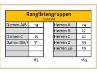 Nach dem erfolgten Meldeschluss sind die Ranglistengruppe jetzt bestimmt. Änderungen im Starterfeld auf Grund Absagen o.ä. haben darauf keinen Einfluss mehr. Bei den Damen werden die Ranglistenklassen D/E/F und A/B...